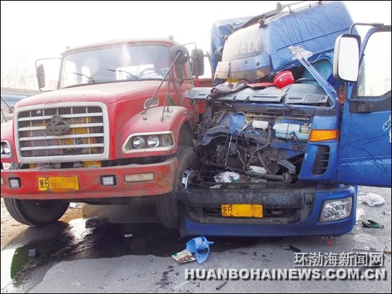 看,疲勞駕駛有多危險(xiǎn)! 圖為事故現(xiàn)場(chǎng)。警方提供 環(huán)渤海新聞網(wǎng)消息 (記者 魏偉)近日,在G112國(guó)道新河莊附近,一輛藍(lán)色貨車撞上一輛停靠在路邊的紅色貨車,所幸駕駛?cè)酥皇芰溯p傷。事故系藍(lán)色貨車駕駛?cè)似?...