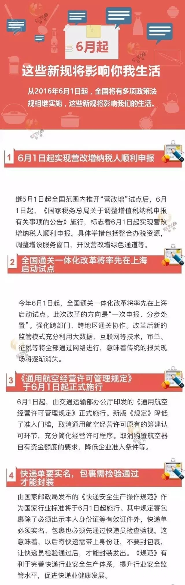 從2016年6月1日起,全國(guó)將有多項(xiàng)政策法規(guī)相繼實(shí)施,快遞實(shí)名、出入境攜帶物品、稅收…這些新規(guī)將如何影響我們的生活呢?