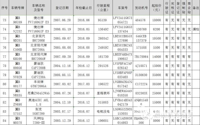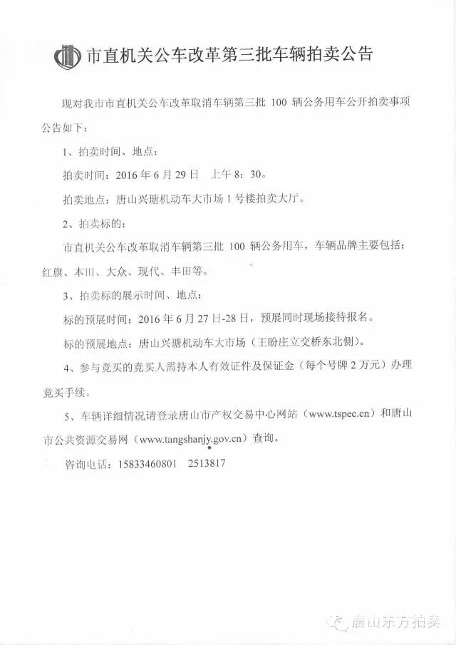 唐山市市直機關(guān)公車改革第三批車輛專場拍賣會 拍賣時間:2016年6月29日 上午8:30 地點:興瑭機動車大市場拍賣中心