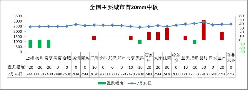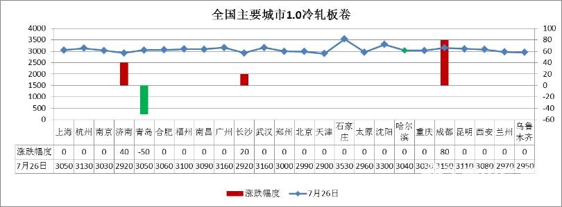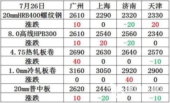 7月26日,黑色系期貨震蕩走強,鋼材現(xiàn)貨市場價格整體盤整上行。具體來看,杭州、福州、廣州、京津冀等10個地區(qū)20mm三級螺紋鋼價格上漲10—60元/噸;濟南、成都、西安等5個地區(qū)價格下跌10—20元/噸。 4.75熱軋市場價 ...
