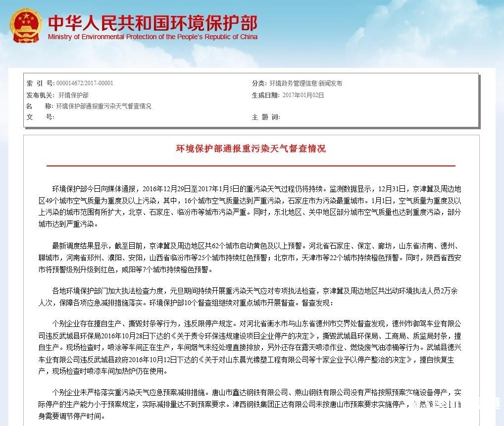 自2017年1月3日零時(shí)起全市重污染天氣橙色Ⅱ級(jí)應(yīng)急響應(yīng)升級(jí)為紅色Ⅰ級(jí)預(yù)警響應(yīng)(詳情戳:緊急通知!唐山1月3日起單雙號(hào)限行!公交免費(fèi)。 1月2日,環(huán)保部通報(bào)重污染天氣督查情況,唐山三企業(yè)未嚴(yán)格落實(shí)重污染天氣應(yīng) ...