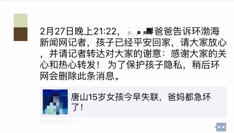 謝天謝地!昨天失聯(lián)的女孩子找到啦! 2月27日環(huán)網(wǎng)發(fā)布《唐山15歲女孩今早失聯(lián),爸媽都急壞了!》。 孩子家長(zhǎng)朋友圈截圖 孩子回家了,大家就都放心了,小編想對(duì)天下所有未成年的孩子們羅嗦幾句: 在你 ...