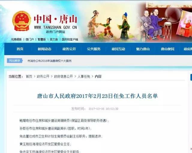 唐山市人民政府2017年2月23日任免工作人員名單 鮑增奇任市住房和城鄉(xiāng)建設(shè)局調(diào)研員(保留正縣級(jí)領(lǐng)導(dǎo)職務(wù)待遇);孫哲任市住房和城鄉(xiāng)建設(shè)局副局長(掛職,時(shí)間1年);免去董仕成市衛(wèi)生和計(jì)劃生育委員會(huì)副主任職務(wù), ...