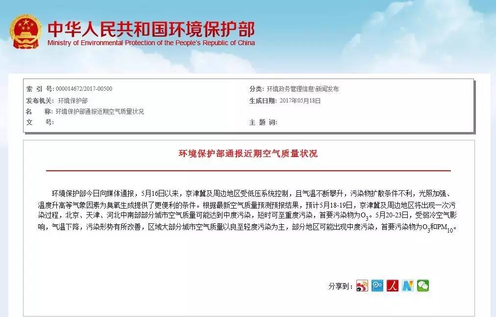 據(jù)環(huán)境保護(hù)部通報: 根據(jù)最新空氣質(zhì)量預(yù)測預(yù)報結(jié)果,預(yù)計5月18-19日,京津冀及周邊地區(qū)將出現(xiàn)一次污染過程,北京、天津、河北中南部部分城市空氣質(zhì)量可能達(dá)到中度污染,短時可至重度污染,首要污染物為O₃。 ...