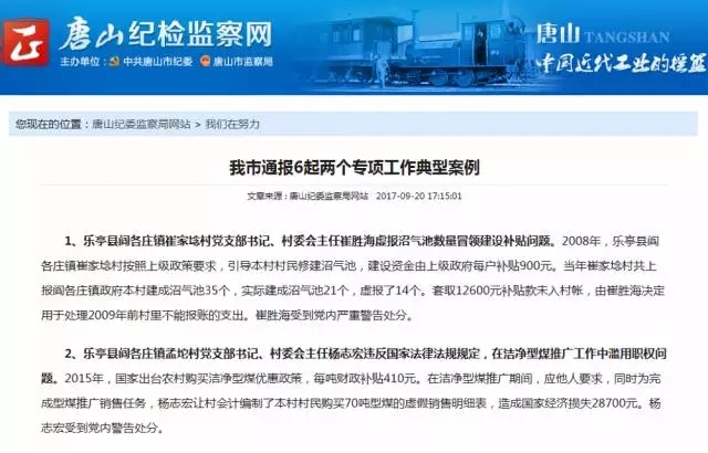 據(jù)唐山紀委監(jiān)察局網(wǎng)站消息, 唐山市通報6起兩個專項工作典型案例。 1、樂亭縣閻各莊鎮(zhèn)崔家埝村黨支部書記、村委會主任崔勝海虛報沼氣池數(shù)量冒領建設補貼問題。 2008年,樂亭縣閻各莊鎮(zhèn)崔家埝村按照上 ...