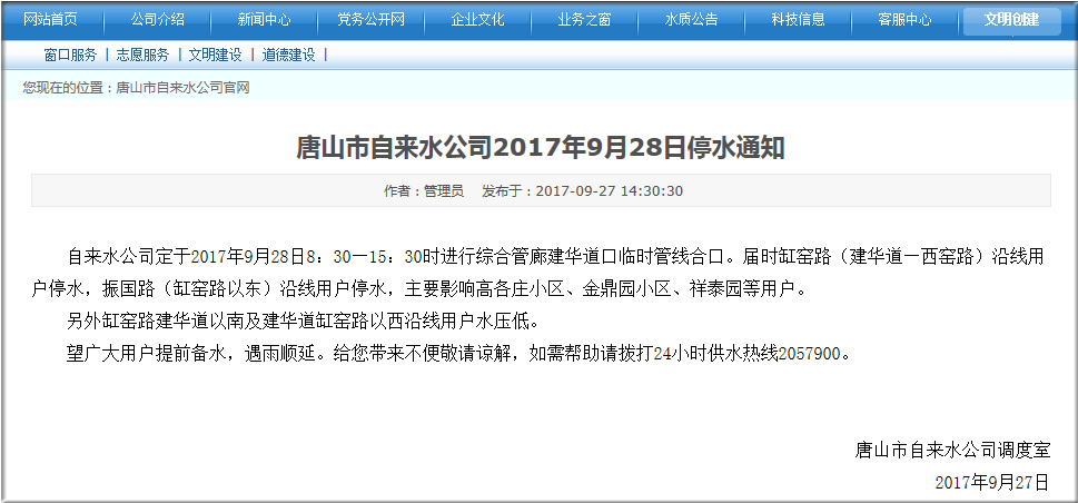 唐山市自來水公司9月27日發(fā)布消息,明天(9月28日)8:30—15:30,缸窯路(建華道—西窯路)、振國路(缸窯路以東)沿線用戶停水。 唐山市自來水公司定于2017年9月28日8:30—15:30進(jìn)行綜合管廊建華道 ...