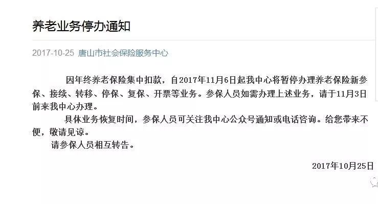 因年終養(yǎng)老保險集中扣款,自2017年11月6日起我中心將暫停辦理養(yǎng)老保險新參保、接續(xù)、轉(zhuǎn)移、停保、復(fù)保、開票等業(yè)務(wù)。參保人員如需辦理上述業(yè)務(wù),請于11月3日前來我中心辦理。 具體業(yè)務(wù)恢復(fù)時間,參保人員可關(guān) ...