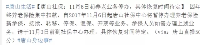 唐山社保:11月6日起養(yǎng)老業(yè)務(wù)停辦,具體恢復(fù)時間待定 因年終養(yǎng)老保險集中扣款,自2017年11月6日起唐山社保中心將暫停辦理養(yǎng)老保險新參保、接續(xù)、轉(zhuǎn)移、停保、復(fù)保、開票等業(yè)務(wù)。參保人員如需辦理上述業(yè)務(wù),請于11 ...