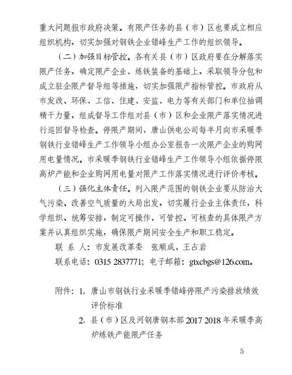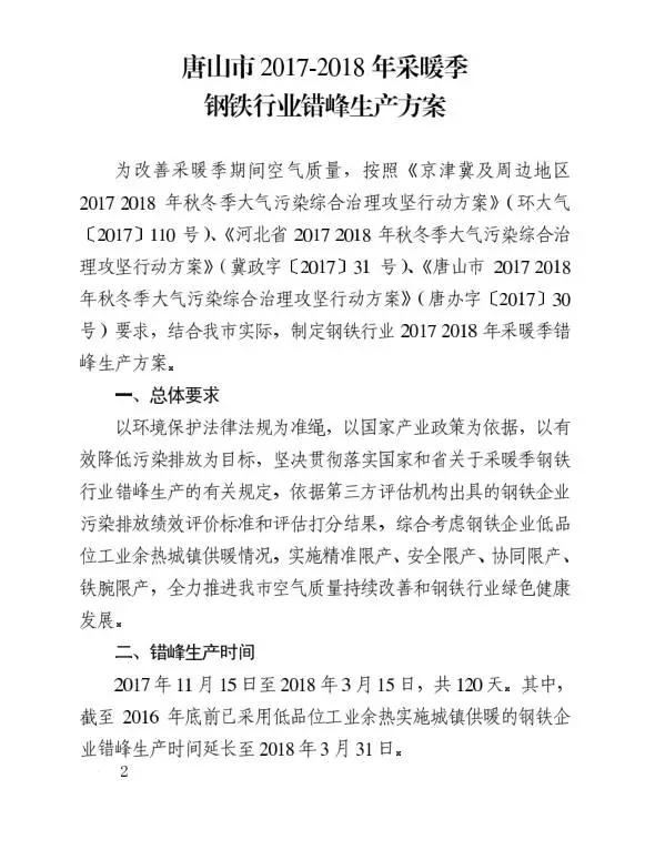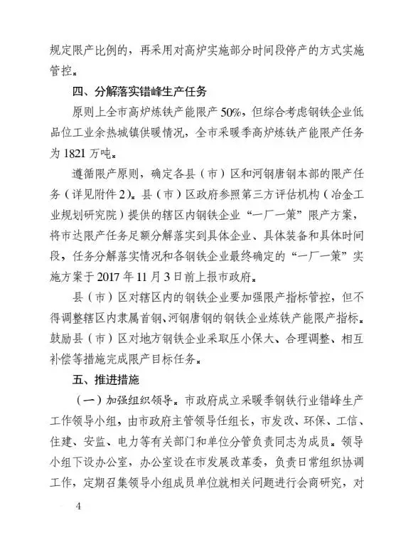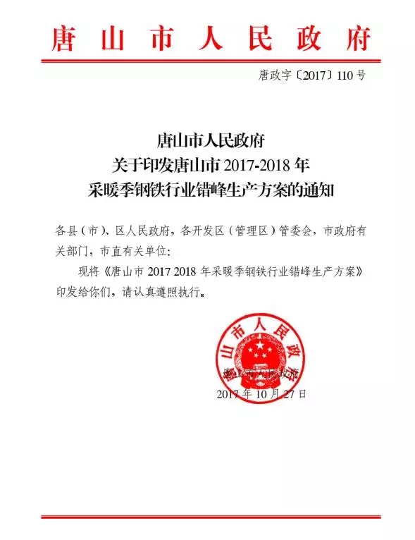 唐山市政府下發(fā)2017-2018年采暖季鋼鐵企業(yè)高爐錯峰生產(chǎn)實施方案,11月15日至3月15日鋼鐵企業(yè)高爐限產(chǎn)120天,全市總限產(chǎn)比例為50%,四個月合計影響高爐生鐵總量為1821萬噸。