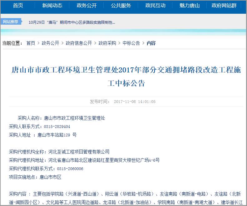 唐山網(wǎng)站11月8日發(fā)布《唐山市市政工程環(huán)境衛(wèi)生管理處2017年部分交通擁堵路段改造工程施工中標(biāo)公告》,公告稱將對部分交通擁堵路段進行改造工程施工。 中國·唐山網(wǎng)站11月8日發(fā)布《唐山市市政工程環(huán)境衛(wèi)生 ...