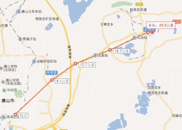 市民朋友注意啦!唐山南站(南新道永紅橋南側(cè))到古冶站計劃要開通軌道客運啦! 路線如下圖