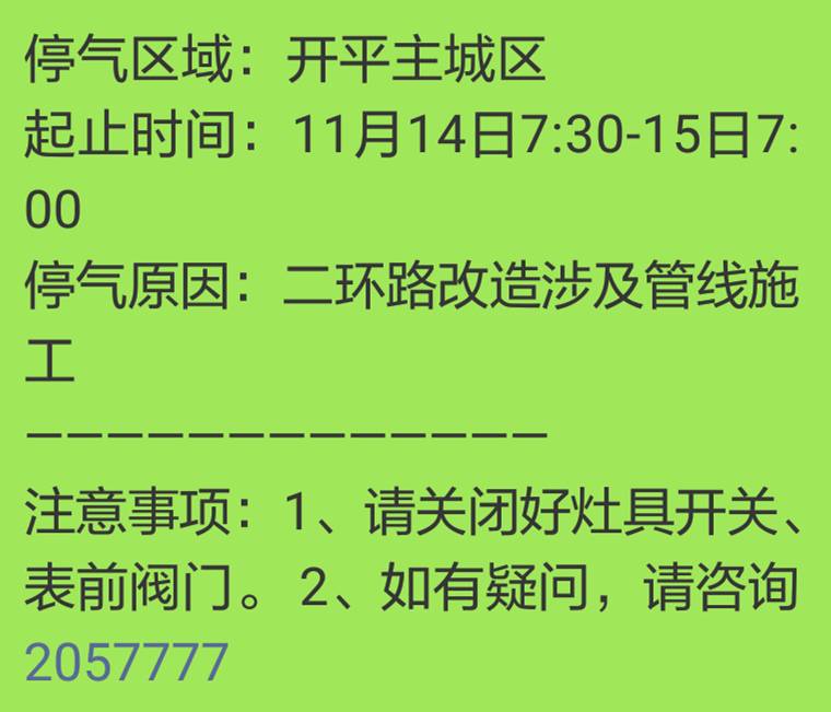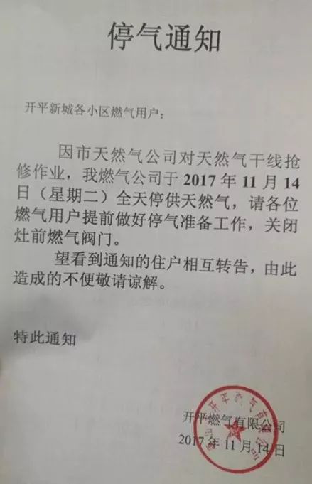 經(jīng)相關部門核實開平主城區(qū)要停氣,時間為11月14日7:30-15日7:00。