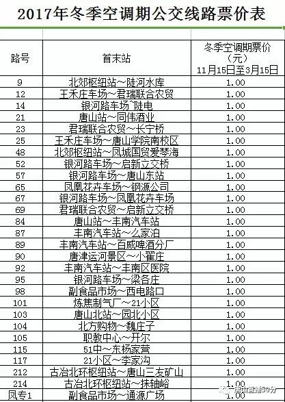 從唐山市公共交通總公司了解到,從11月15日起至明年3月15日,唐山公交車(chē)將執(zhí)行冬季空調(diào)期票價(jià)。 執(zhí)行冬季空調(diào)期票價(jià)后具體票價(jià)如下表:一元票價(jià)線路 ...