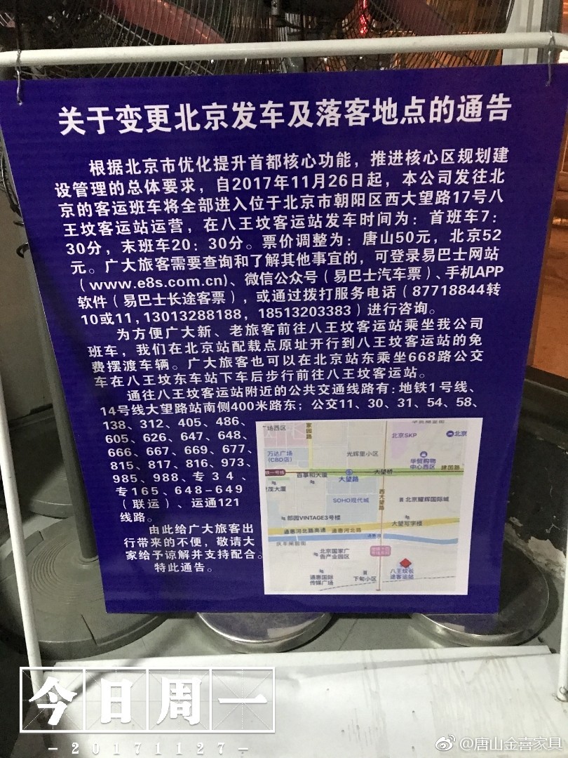 自11月26日起,疏解關(guān)停位于北京站前郵通街北鮮魚巷內(nèi)的八王墳長(zhǎng)途客運(yùn)站北京站配載點(diǎn),原在該站點(diǎn)運(yùn)行的北京至唐山客運(yùn)班線及車輛,全部遷至位于朝陽(yáng)區(qū)西大望路17號(hào)的八王墳客運(yùn)站繼續(xù)運(yùn)營(yíng)。票價(jià)調(diào)整為唐山50元,北 ...