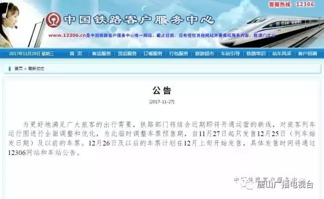 12月26日及以后的車(chē)票將暫停發(fā)售 據(jù)12306網(wǎng)站消息,為更好地滿足廣大旅客的出行需要,鐵路部門(mén)將結(jié)合近期即將開(kāi)通運(yùn)營(yíng)的新線,對(duì)旅客列車(chē)運(yùn)行圖進(jìn)行全面調(diào)整和優(yōu)化,為此臨時(shí)調(diào)整車(chē)票預(yù)售期,自11月27日起只 ...