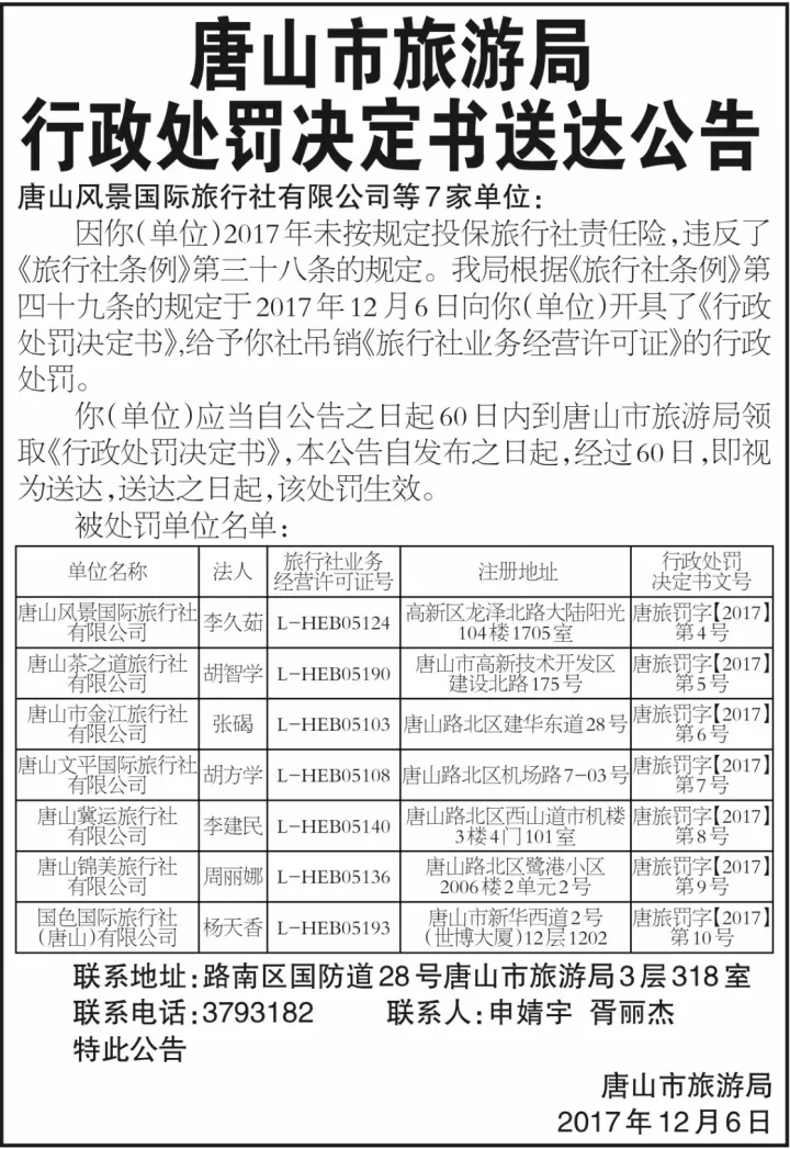 唐山市旅游局行政處罰決定書送達(dá)公告 唐山風(fēng)景國際旅行社有限公司等7家單位: 因你(單位)2017年未按規(guī)定投保旅行社責(zé)任險,違反了《旅行社條例》第三十八條的規(guī)定。我局根據(jù)《旅行社條例》第四十九條的規(guī)定于201 ...