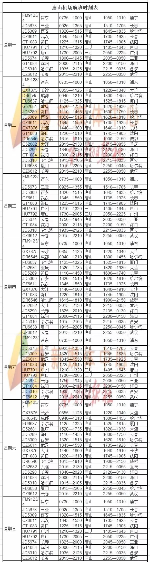 從明天(12月16日)起,唐山機(jī)場(chǎng)每周六唐山飛往?诘暮桨鄷r(shí)刻有變,時(shí)間改為21:20在唐山起飛,01:30到達(dá)?。 執(zhí)行日期為2017年12月16日至2018年3月24日。 唐山機(jī)場(chǎng)最新航班時(shí)刻表