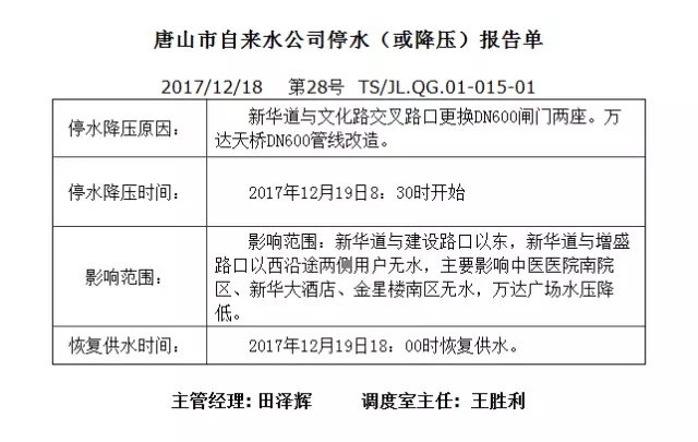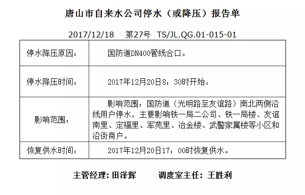 停水通知 自來水公司定于2017年12月20日8:30—17:00進(jìn)行國防道DN400管線合口。 屆時國防道(光明路至友誼路)南北兩側(cè)沿線用戶停水,主要影響鐵一局二公司、鐵一局樓、友誼南 ...