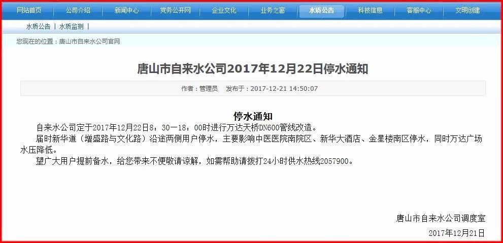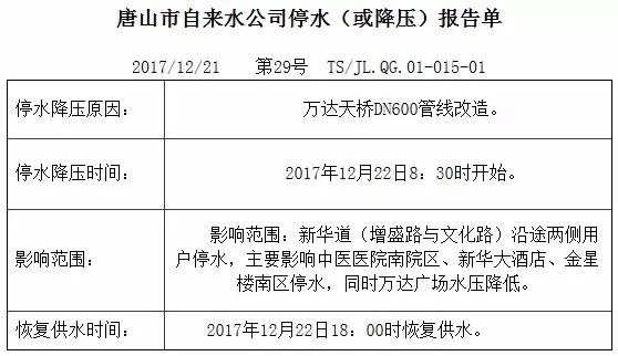 唐山市自來水公司定于2017年12月22日8:30—18:00進(jìn)行萬達(dá)天橋DN600管線改造。屆時新華道(增盛路與文化路)沿途兩側(cè)用戶停水,主要影響中醫(yī)醫(yī)院南院區(qū)、新華大酒店、金星樓南區(qū)停水,同時萬達(dá)廣場水壓降低。 ...