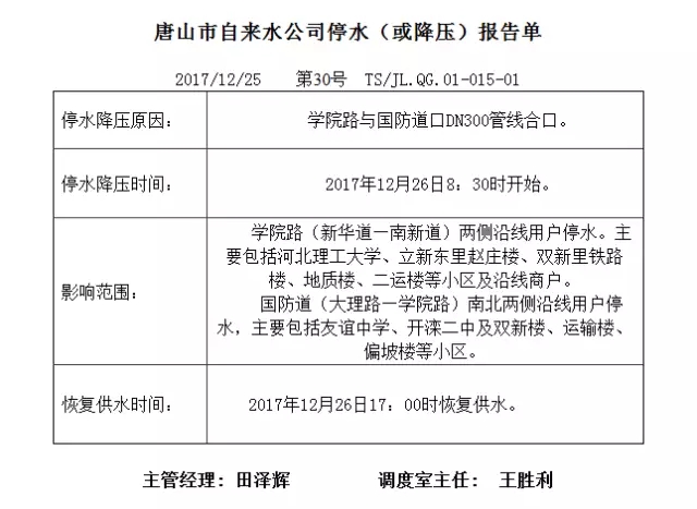 停水通知 自來水公司定于2017年12月26日8:30—17:00進(jìn)行學(xué)院路與國防道口DN300管線合口。屆時學(xué)院路(新華道—南新道)沿線兩側(cè)用戶停水。主要包括華北理工大學(xué)、立新東里趙莊樓、雙新里鐵路樓、地質(zhì)樓、二運樓等 ...
