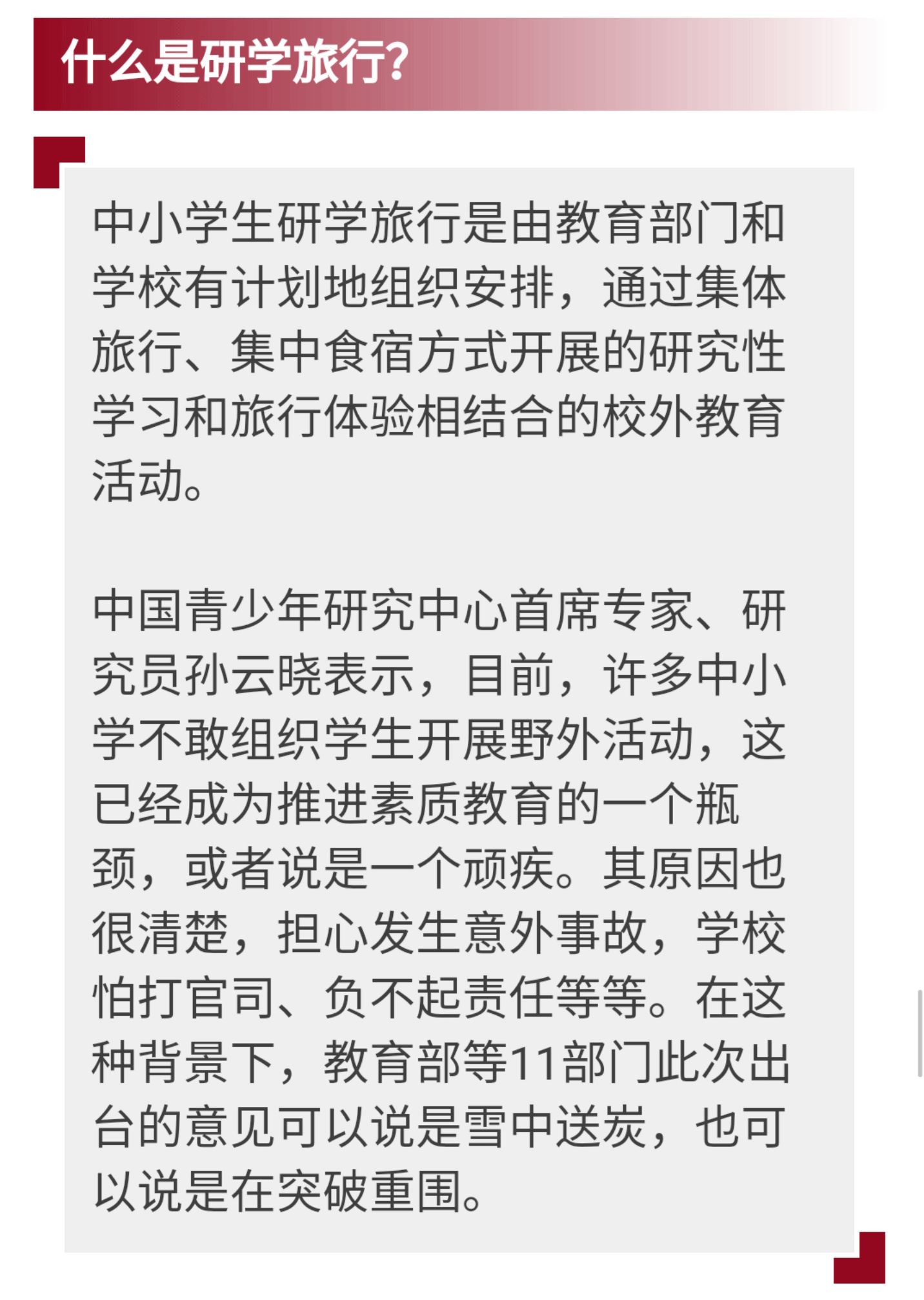 近日,教育部公布第一批全國(guó)中小學(xué)生研學(xué)實(shí)踐教育基地、營(yíng)地名單,我省7家入選。此前,教育部等11部門(mén)印發(fā)了《關(guān)于推進(jìn)中小學(xué)生研學(xué)旅行的意見(jiàn)》。要求各中小學(xué)把研學(xué)旅行納入學(xué)校教育教學(xué)計(jì)劃,逐步建立小學(xué)階段以 ...