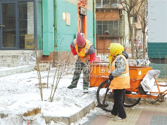 環(huán)渤海新聞網(wǎng)消息 1月26日上午,在友誼路上,兩名環(huán)衛(wèi)工人冒著嚴(yán)寒,正將清掃車?yán)锏难〾K鏟到綠化隔離帶內(nèi)。"這些積雪都是從人行便道上清理出來的,這樣行人走路就不用擔(dān)心滑倒了。"環(huán)衛(wèi)工人說,"這些 ...