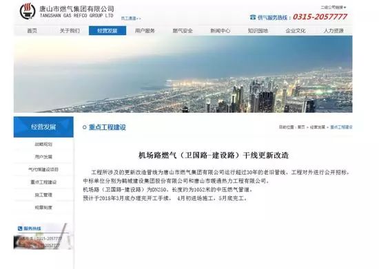 好消息!好消息!唐山市燃?xì)饧瘓F(tuán)公司網(wǎng)站發(fā)布通知燃?xì)飧删要更新改造啦! 01機(jī)場(chǎng)路燃?xì)猓ㄐl(wèi)國(guó)路-建設(shè)路)干線將于4月初進(jìn)行更新改造 工程名稱:唐山市古冶區(qū)天然氣輸配系統(tǒng)改擴(kuò)建工程-205國(guó)道南輔路(唐 ...