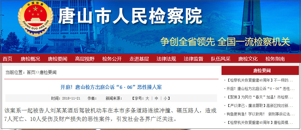 前段時間,報道了《煤醫(yī)道“6.06”案件最新進展!唐山檢方對被告人劉某某依法提起公訴》有了最新進展。2018年11月21日,唐山市人民檢察院發(fā)布最新通告:“6.06”惡性撞人案開庭審理,被告人劉某當庭認罪。 唐山市人 ...