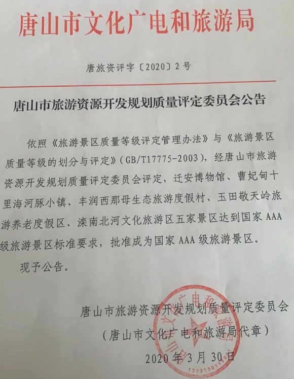 近日,唐山市旅游資源開發(fā)規(guī)劃質(zhì)量評(píng)定委員會(huì)下發(fā)公告,正式批準(zhǔn)敬天嶺旅游養(yǎng)老度假區(qū)成為國家AAA級(jí)旅游景區(qū),這標(biāo)志著玉田縣旅游工作發(fā)展又取得了新成效。 景區(qū)位于玉田縣城北燕山腳下,南鄰玉田八大景之一 ...