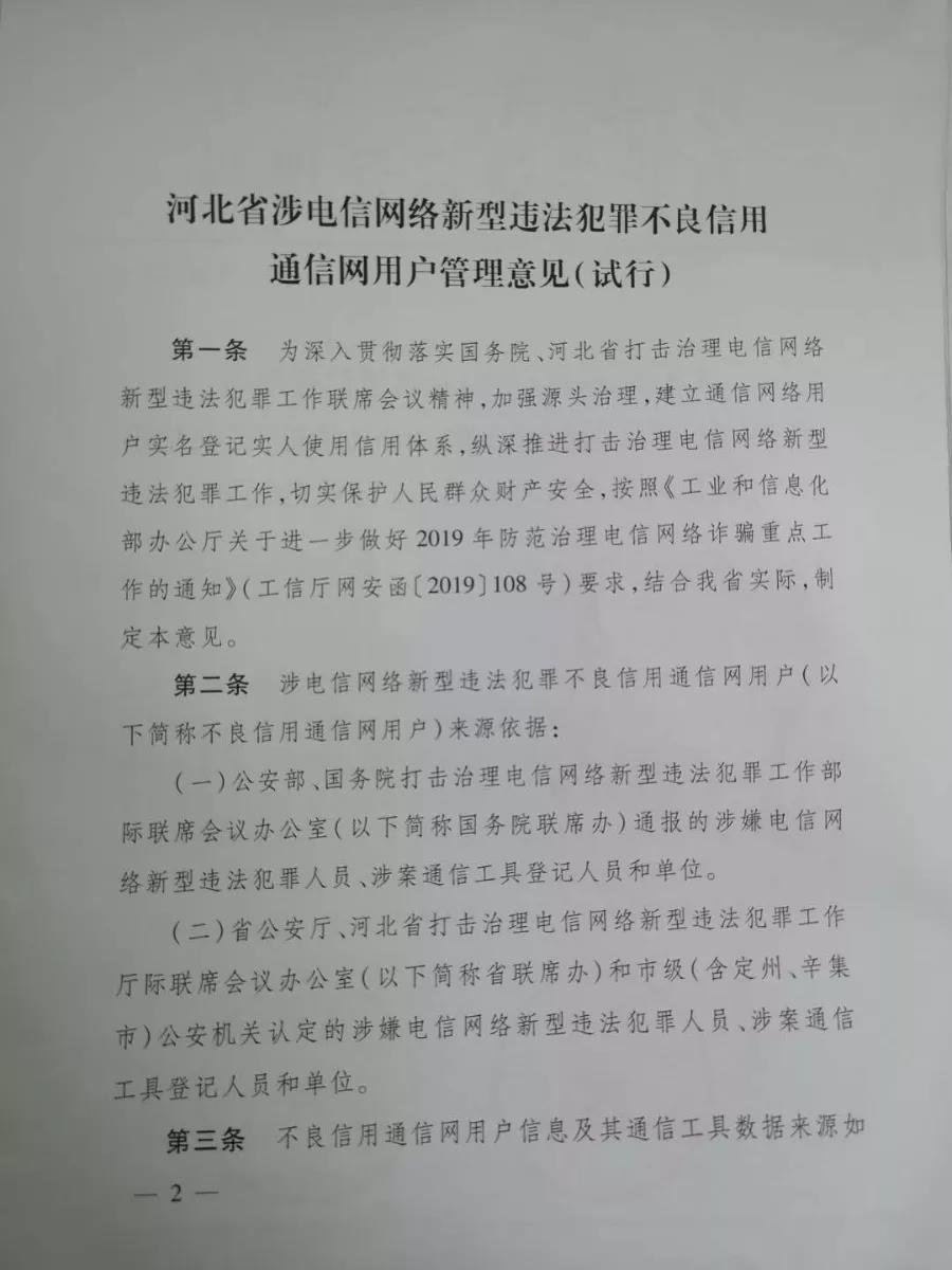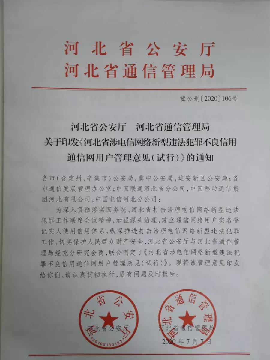 為深入貫徹落實公安部、省公安廳的工作部署,加強源頭治理,縱深推進(jìn)打擊治理電信網(wǎng)絡(luò)新型違法犯罪工作,切實保護(hù)人民群眾財產(chǎn)安全。依照《河北省涉電信網(wǎng)絡(luò)新型違法犯罪不良信用通信網(wǎng)用戶管理意見(試行)》,唐 ...
