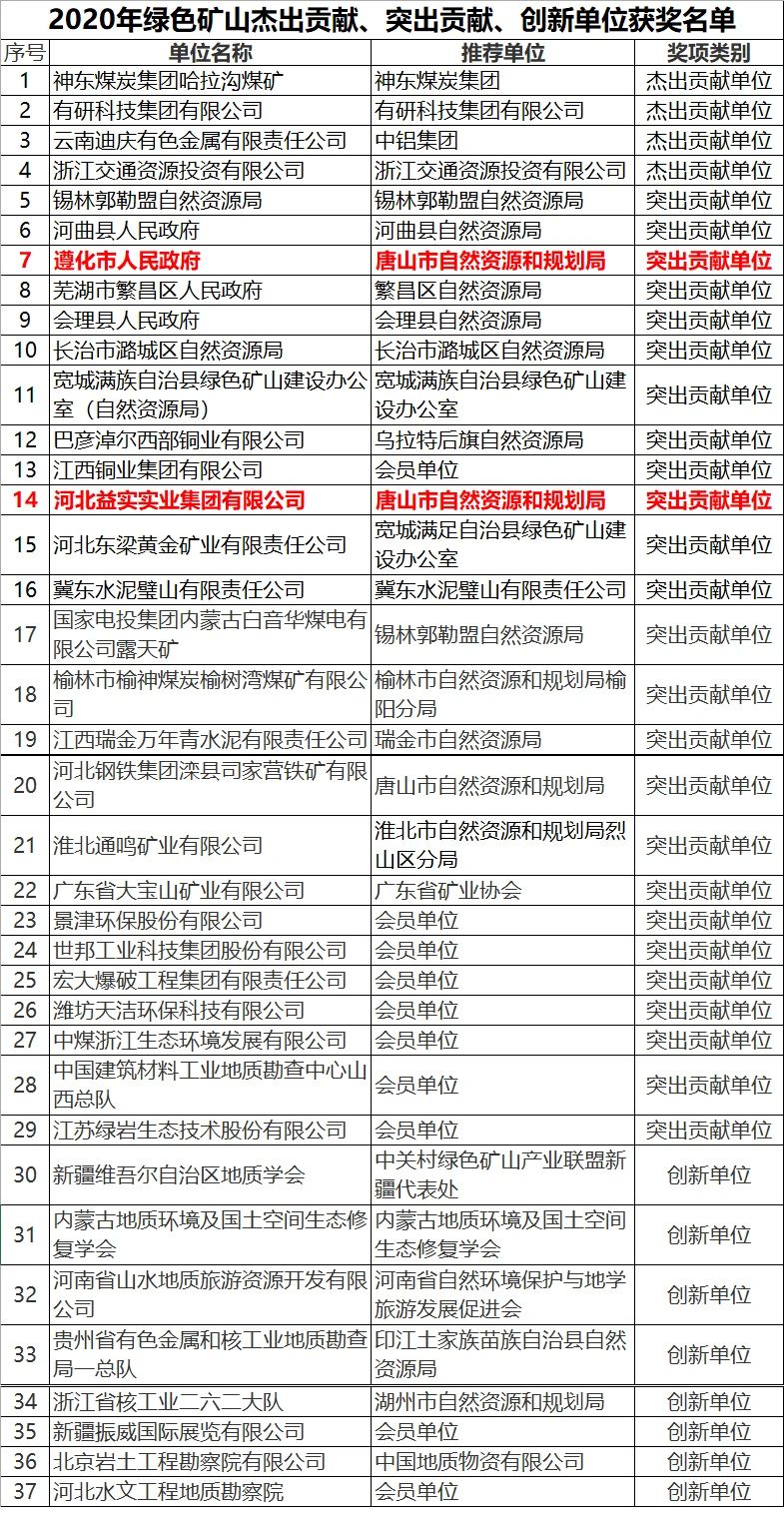 日前傳來(lái)喜訊國(guó)家綠色礦山科學(xué)技術(shù)獎(jiǎng)勵(lì)辦公室評(píng)選遵化市人民政府、河北益實(shí)實(shí)業(yè)集團(tuán)有限公司為“2020年度綠色礦山突出貢獻(xiàn)單位”!全國(guó)37家單位獲獎(jiǎng),唐山唯此兩家! ...