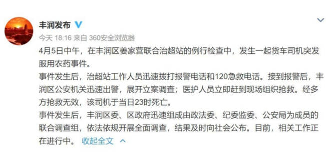 記者從唐山市政府獲悉,2021年4月5日,唐山市豐潤區(qū)境內(nèi)發(fā)生貨車司機(jī)金德強(qiáng)服用農(nóng)藥死亡事件后,唐山市立即組成了公安、紀(jì)檢、交通、衛(wèi)健、司法等部門參加的聯(lián)合調(diào)查組,依法依規(guī)進(jìn)行了 ...