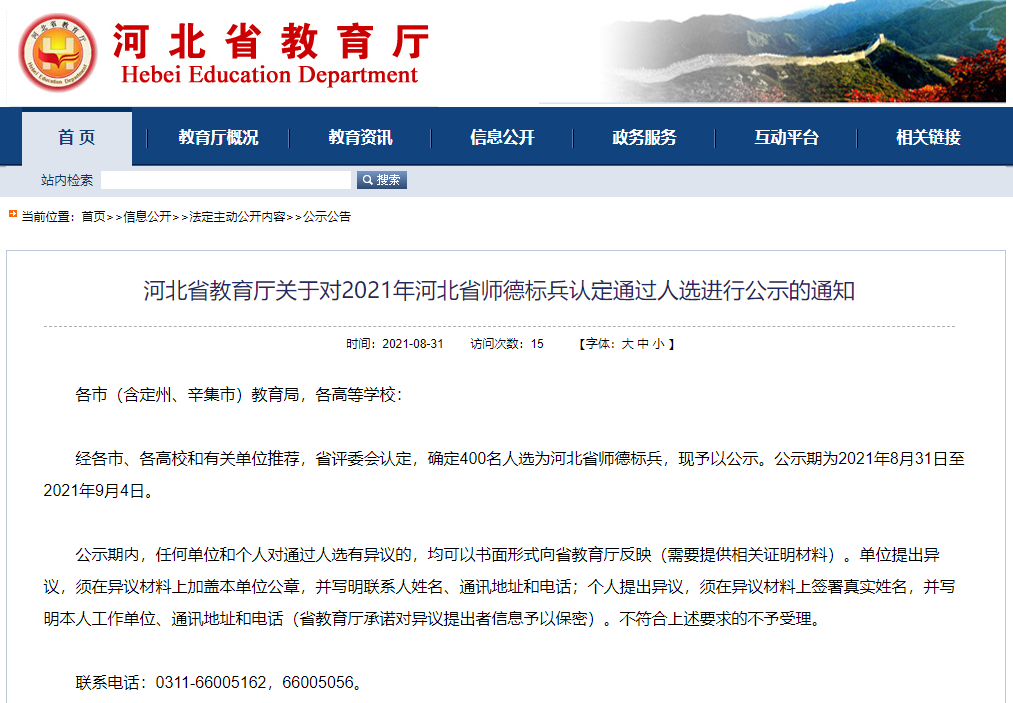 河北省教育廳最新通知!經(jīng)各市、各高校和有關(guān)單位推薦,省評委會認(rèn)定,確定400名人選為河北省師德標(biāo)兵,并正式公示。
