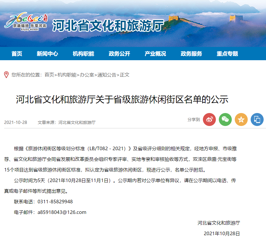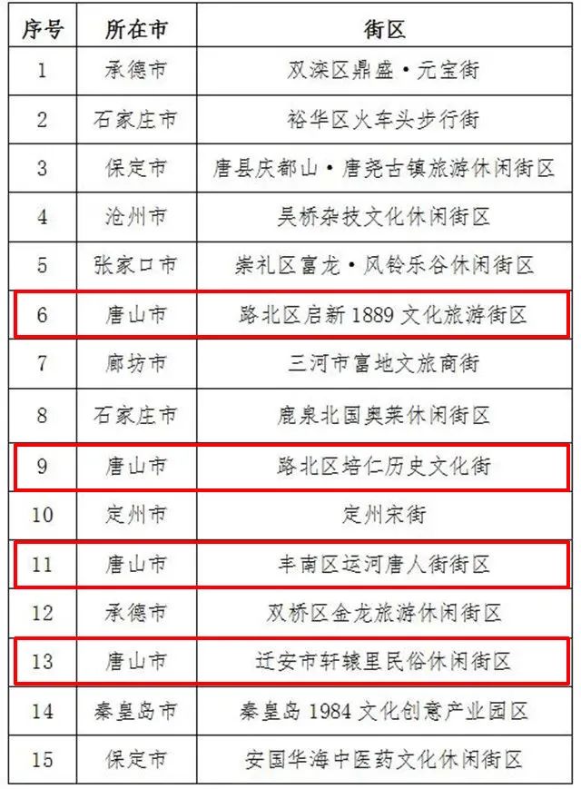 10月28日,河北省文化和旅游廳官網(wǎng)最新發(fā)布《河北省文化和旅游廳關(guān)于省級旅游休閑街區(qū)名單的公示》,15個項目達(dá)到省級旅游休閑街區(qū)標(biāo)準(zhǔn)(其中唐山有4個項目入選),擬認(rèn)定為省級旅游休閑街區(qū)。