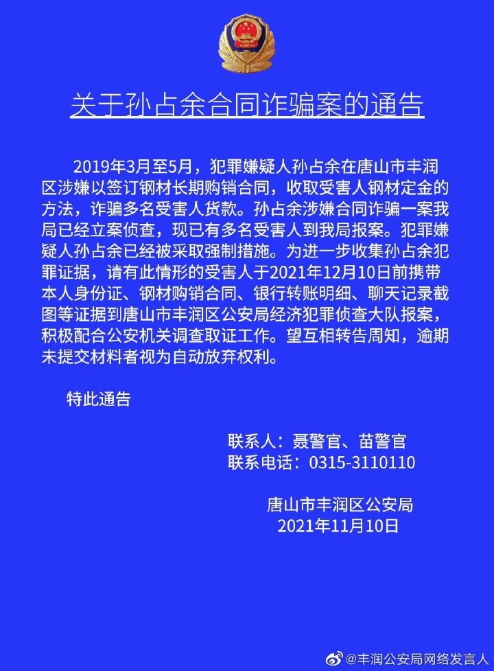 關(guān)于孫占余合同詐騙案的通告2019年3月至5月,犯罪嫌疑人孫占余在唐山市豐潤區(qū)涉嫌以簽訂鋼材長期購銷合同,收取受害人鋼材定金的方法,詐騙多名受害人貨款。孫占余涉嫌合同詐騙一案我局已經(jīng)立案偵查,現(xiàn)已有多名受害 ...
