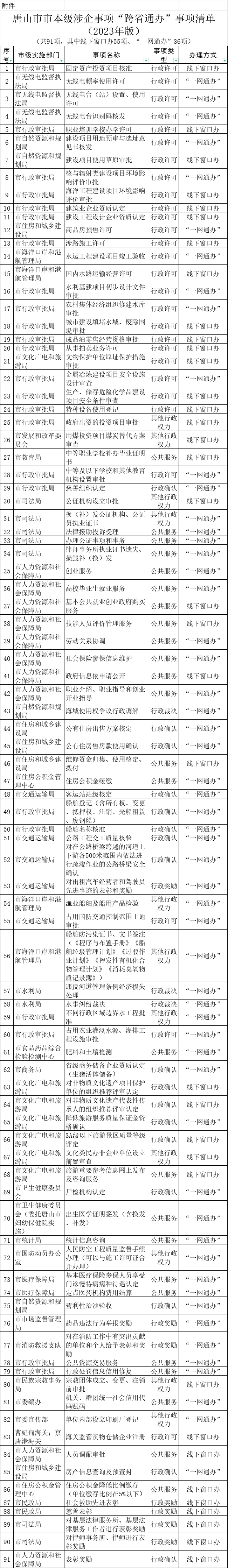 關(guān)于公布《唐山市市本級涉企事項“跨省通辦”事項清單(2023年版)》的公告為進(jìn)一步優(yōu)化營商環(huán)境,滿足企業(yè)異地辦事需求,提高企業(yè)群眾滿意度,根據(jù)工作實際,我辦梳理形成了《唐山市市本級涉企事項“跨省通辦”事項 ...