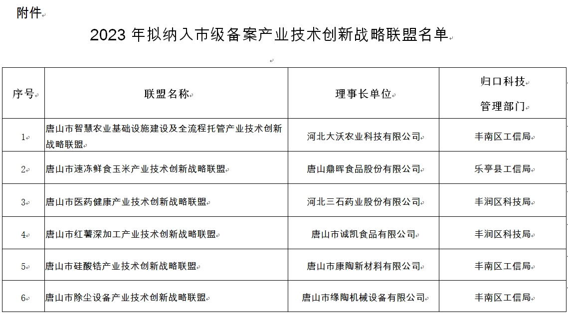 唐山市科學(xué)技術(shù)局 關(guān)于2023年擬納入市級備案產(chǎn)業(yè)技術(shù)創(chuàng)新戰(zhàn)略聯(lián)盟名單的公示根據(jù)《唐山市產(chǎn)業(yè)技術(shù)創(chuàng)新戰(zhàn)略聯(lián)盟建設(shè)管理辦法》(唐科規(guī)字〔2020〕5號),經(jīng)各歸口管理部門推薦、專家評審、現(xiàn)場考察和局黨組會議研究, ...