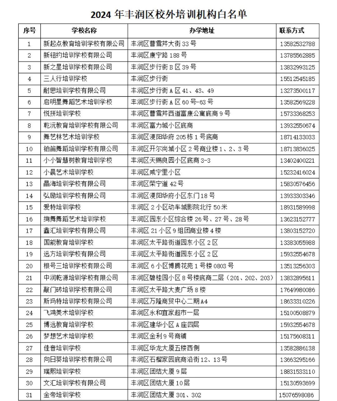寒假將至,為進(jìn)一步鞏固校外培訓(xùn)治理成效,嚴(yán)防學(xué)科類培訓(xùn)隱形變異,強(qiáng)化非學(xué)科類培訓(xùn)監(jiān)管,幫助中小學(xué)生度過(guò)愉快充實(shí)的假期,保障孩子和您的切身權(quán)益,唐山市豐潤(rùn)區(qū)教育局公布校外培訓(xùn)機(jī)構(gòu)白名單,詳情如下: ...