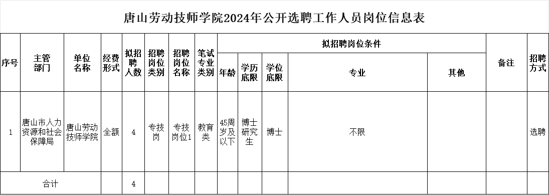 唐山勞動(dòng)技師學(xué)院2024年公開(kāi)選聘博士研究生公告為滿(mǎn)足我院工作需要,根據(jù)《事業(yè)單位人事管理?xiàng)l例》《河北省事業(yè)單位公開(kāi)招聘工作人員暫行辦法》等文件精神,經(jīng)上級(jí)批準(zhǔn),面向社會(huì)公開(kāi)選聘博士研究生4名,均為事業(yè)編 ...