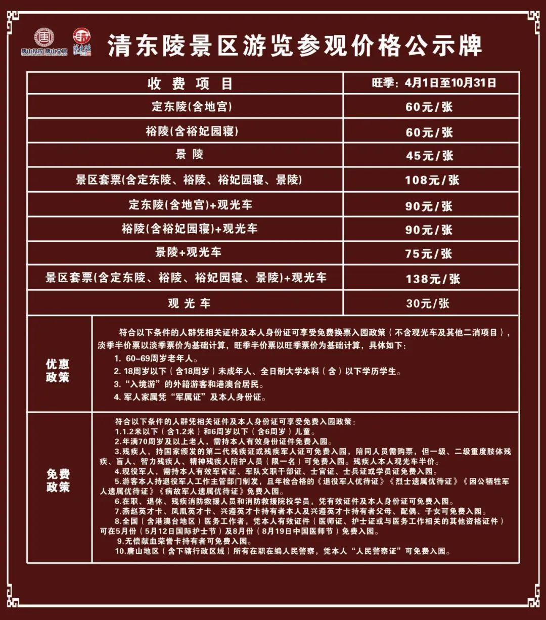 關(guān)于清東陵景區(qū)實(shí)施旺季運(yùn)營管理的通告尊敬的游客朋友們: 隨著季節(jié)的變化和景區(qū)實(shí)際運(yùn)營情況的調(diào)整,為了給您提供更加優(yōu)質(zhì)的游覽體驗(yàn),清東陵景區(qū)現(xiàn)將2025年旺季期間的門票價(jià)格及相關(guān)事宜通告如下:一、旺季時(shí)間4月 ...