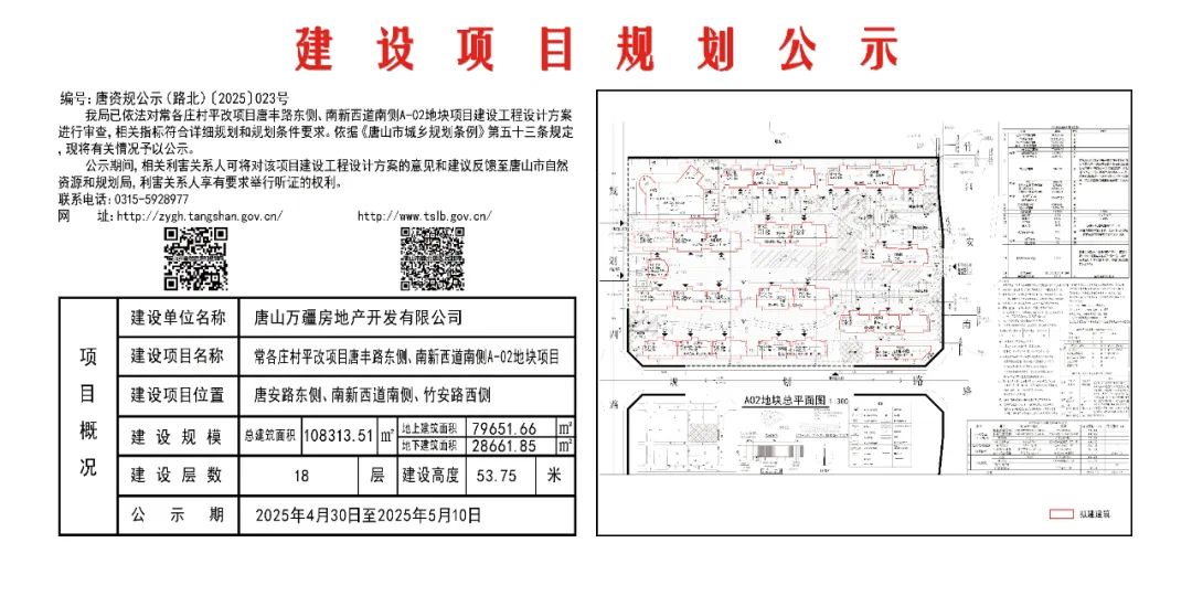 建設(shè)項目規(guī)劃公示 (常各莊村平改項目唐豐路東側(cè)、南新西道南側(cè)A-02地塊項目) 編號:唐資規(guī)公示(路北)(2025〕023號 項目概況 建設(shè)單位名稱:唐山萬疆房地產(chǎn)開發(fā)有限公司 建設(shè)項目名稱:常各莊村平改項目唐 ...