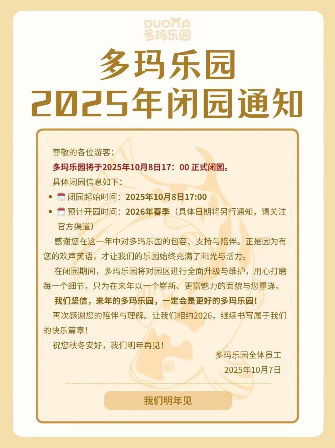 唐山市曹妃甸區(qū)公共交通有限公司 關(guān)于調(diào)整旅游1號線的通告尊敬的乘客朋友們: 根據(jù)多瑪樂園通知,多瑪樂園于2025年10月8日17:00起正式閉園。涉及我公司旅游1號線則同步停止運行。 & ...