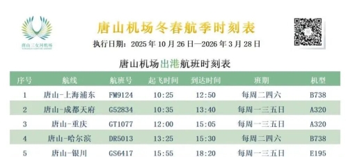 唐山機場自10月26日起執(zhí)行冬春航季航班計劃