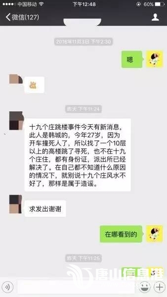 昨日一篇突發(fā)!唐山十九各莊有人跳樓了!逝者已逝!望逝者安息!珍愛生命,關(guān)愛他人。