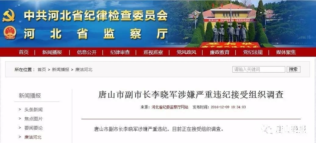 河北省紀委監(jiān)察廳網(wǎng)站12月9日發(fā)布消息,唐山市副市長李曉軍涉嫌嚴重違紀,目前正在接受組織調(diào)查。 來源:河北省紀委監(jiān)察廳網(wǎng)站