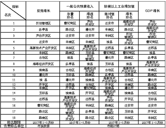 2017年各縣(市、區(qū))落實(shí)全市重點(diǎn)工作指標(biāo)情況排名 備注:1.此表為唐山市各縣(市、區(qū))落實(shí)全市重點(diǎn)工作關(guān)于保持經(jīng)濟(jì)增長(zhǎng)情況排名(共細(xì)化為4項(xiàng)指標(biāo),分別是投資增長(zhǎng)、一般公共預(yù)算收入、規(guī)模以上工業(yè)增加值和GD ...