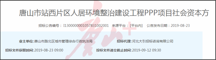 8月23日,中國河北網(wǎng)站發(fā)布的《唐山市站西片區(qū)人居環(huán)境整治建設(shè)工程PPP項(xiàng)目社會資本方》招標(biāo)公告顯示: 估算總投資88.9億用于站西片區(qū)人居環(huán)境整治建設(shè)工程,工程區(qū)域?yàn)槲髦吝\(yùn)河?xùn)|路、南至南湖大道、東至站前路和西 ...