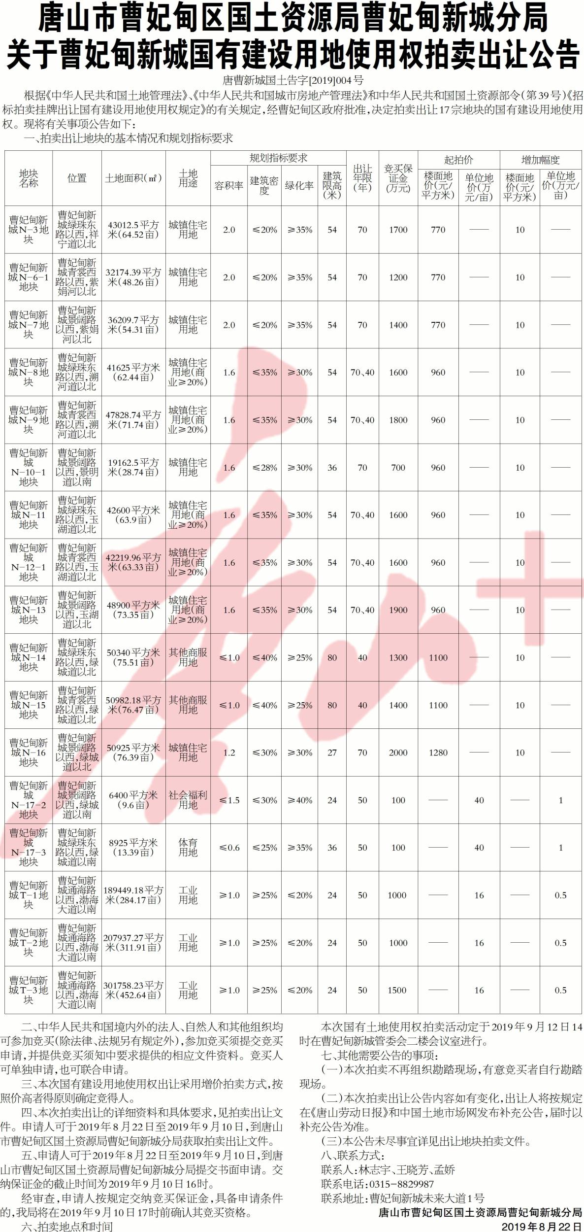 8月23日,《唐山勞動日報》刊發(fā)《唐山市曹妃甸區(qū)國土資源局曹妃甸新城分局關(guān)于曹妃甸新城國有建設(shè)用地使用權(quán)拍賣出讓公告》,涉及17宗地塊。開發(fā)用途為城鎮(zhèn)住宅、社會福利、商業(yè)用地、工業(yè)用地等。詳細內(nèi)容如下 ...