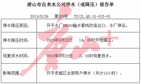 8月26日,唐山市自來水公司發(fā)布停水通知,28日14時起,開平老城區(qū)全部用戶停水(共計12小時)。詳情如下:
