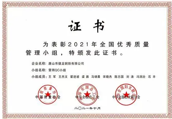 河北新聞網(wǎng)訊( 馬嘯晨)近日,從河北省質量協(xié)會獲悉,唐山市德龍鋼鐵有限公司參評“河北省全行業(yè)第四十二次質量管理成果評比”的8項質量管理成果均斬獲“特等獎”,該公司“雷雨QC小組 ...